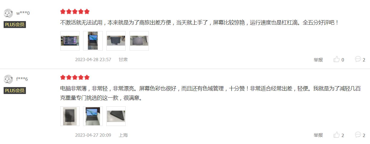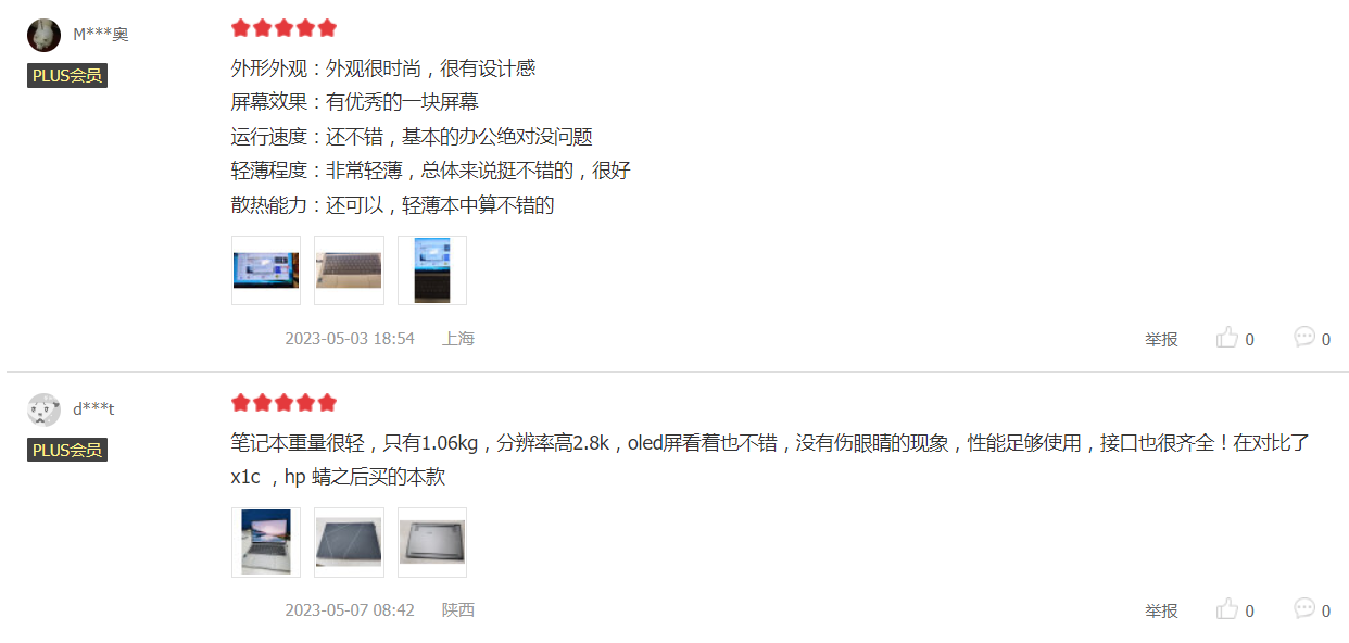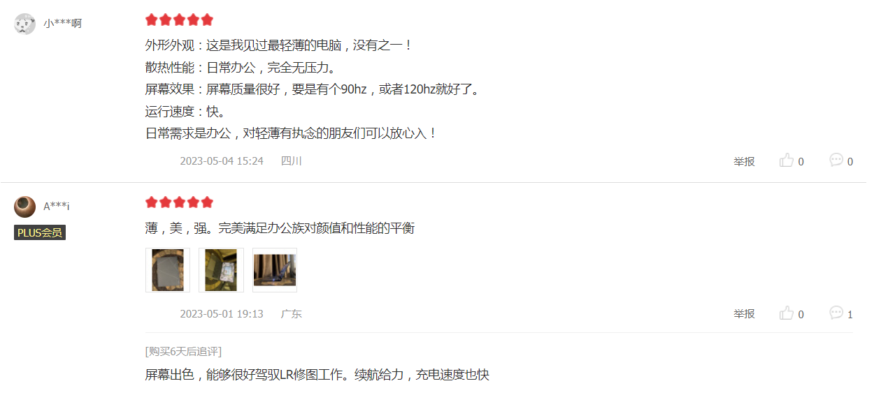 对此,很多用户都给出了“性能足够使用”、“基本的办公绝对没问题”、“运行速度快,自带office套件”、“能够很好驾驭LR修图工作”、“性能也很棒”等好评,对灵耀13 2023的满意溢于言表。