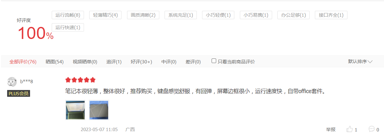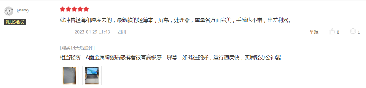 在京东平台上,灵耀13 2023的首销用户大都认为它运行流畅、轻薄精巧、画质清晰、小巧轻便等。大家都对它的轻薄表示出不同程度的惊喜和满意,认为是外出或出差最合适的笔记本了,尤其适合“对轻薄有执念的朋友们”,有的用户直接表示,就是“为了减轻几百克重量专门挑选的这一款”,到手之后感觉最合适办公和出差了。