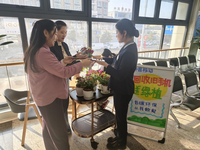 在科技迭代飞速的当下,新旧手机的交替愈发频繁,许多闲置旧机被悄然搁置角落,不仅浪费资源,其废旧电池、零部件更可能成为破坏环境的隐患。近日,在中国移动江苏公司连云港分公司(以下简称连云港移动)东海海陵西路旗舰服务厅,以一场“回收旧手机,赠送小绿植”的暖心活动,为闲置旧机赋予新价值,为低碳生活注入鲜活绿意,让环保理念在双向奔赴中落地生根。